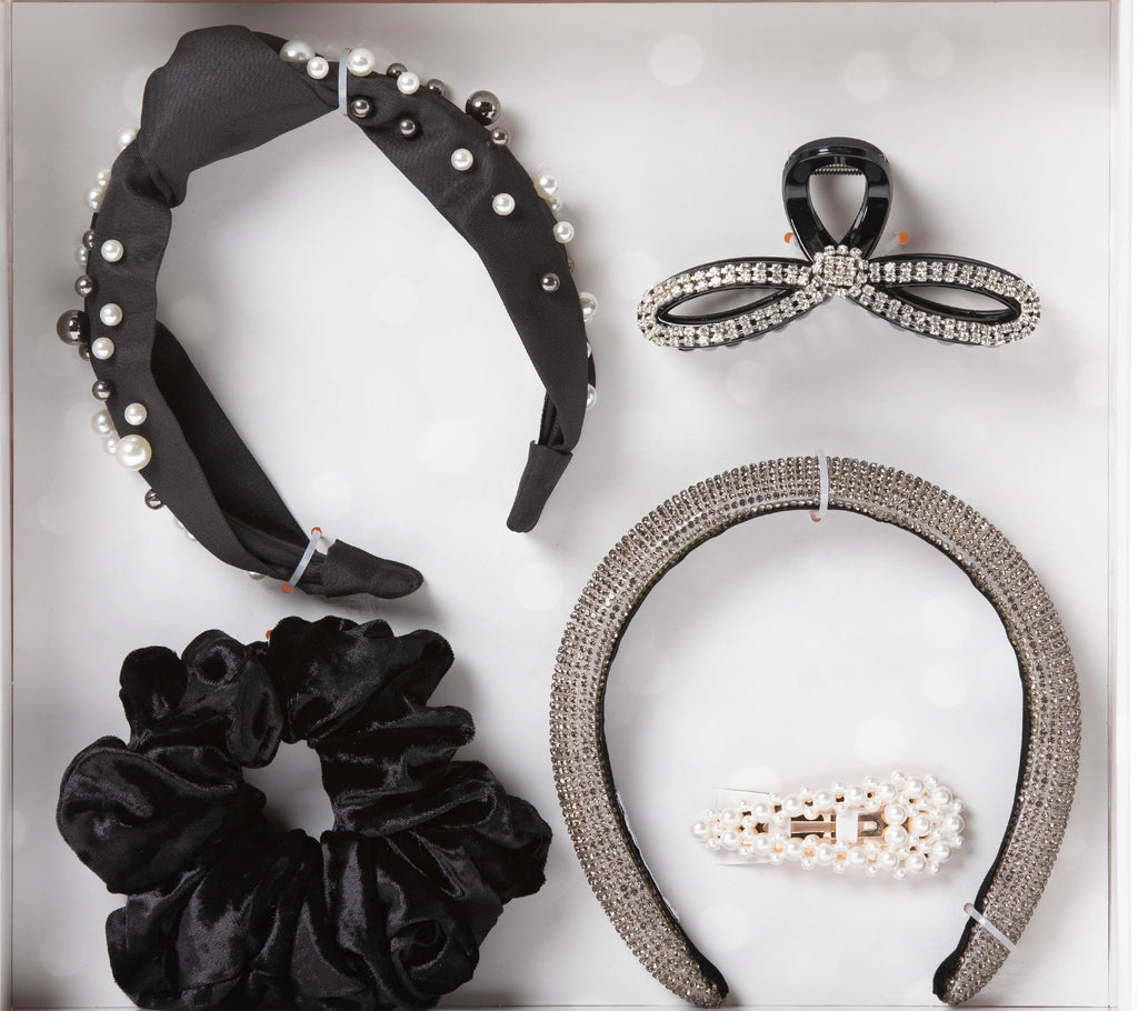 5 Piece Set Includes: Fashion Headband, Everyday Headband, Voluminous Scrunchy, Curated Hair Clip and Barrette.